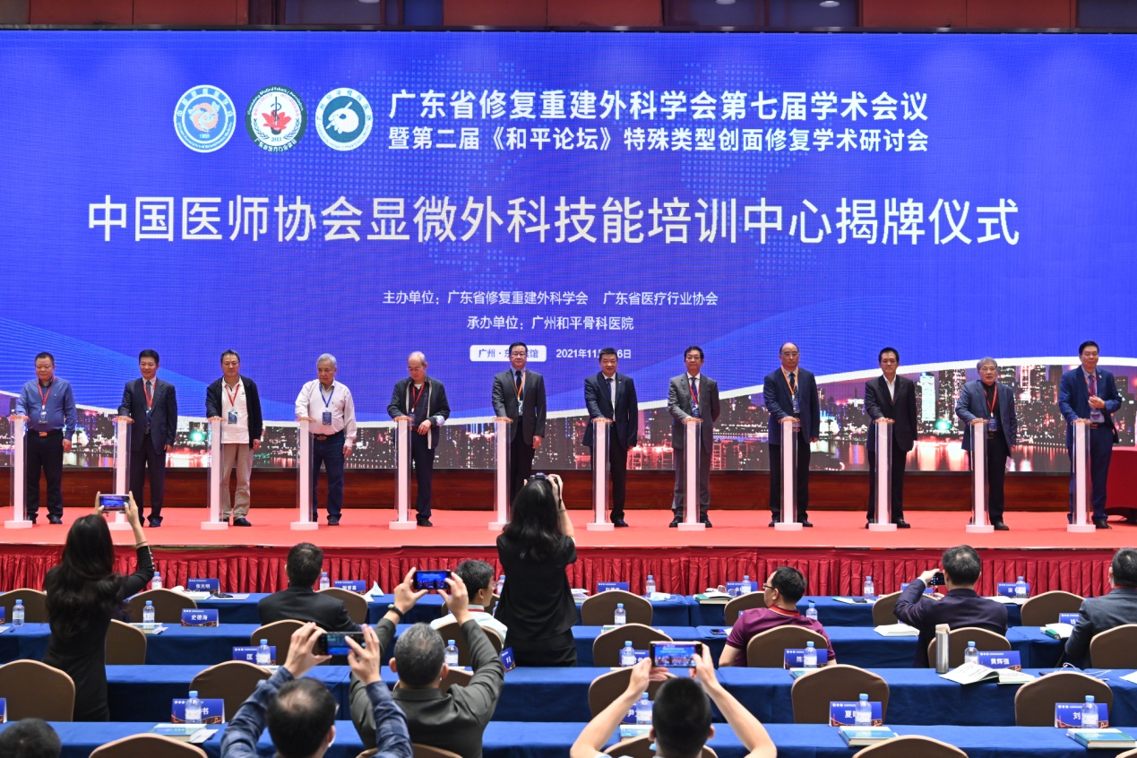 在剛剛過去的廣東省修復(fù)重建外科學(xué)會(huì)第七屆學(xué)術(shù)會(huì)議暨第二屆《和平論壇》特殊類型創(chuàng)面修復(fù)學(xué)術(shù)研討會(huì)上,中國(guó)醫(yī)師協(xié)會(huì)顯微外科醫(yī)師分會(huì)會(huì)長(zhǎng)趙德偉教授、中華醫(yī)學(xué)會(huì)手外科學(xué)會(huì)主任委員勞杰教授等專家領(lǐng)導(dǎo)共同為廣州和平骨科醫(yī)院顯微外科技能培訓(xùn)中心揭牌。